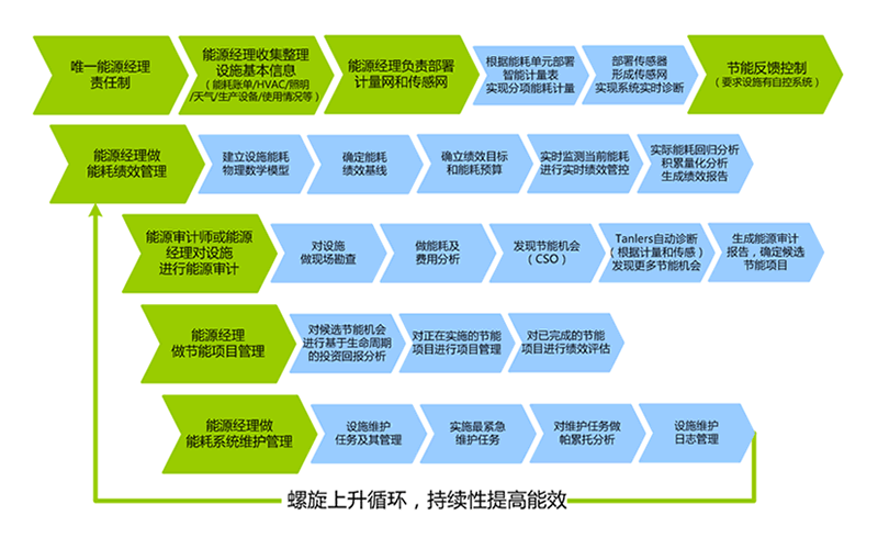 - 节能也是一项持续性的管理,是一个“测量 – 分析 – 行动”的螺旋优化上升过程。