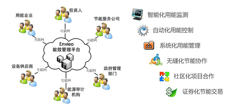 - 合作:用能企业与节能服务公司、投资人、政府管理部门、能源设计机构和设备供应商通过Envieo社区,合作实现节能项目。