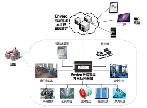 Envieo是一个基于物联网和云计算技术的节能管理软硬件平台。应用此平台,用能企业可以系统化、持续性地优化能耗成本。同时,用能企业、节能服务公司、投资人、设备供应商、能源审计机构和政府管理部门,通过Envieo实现高效、无缝化的企业能源管理协作。